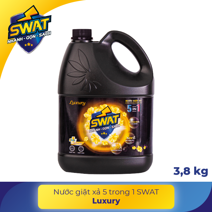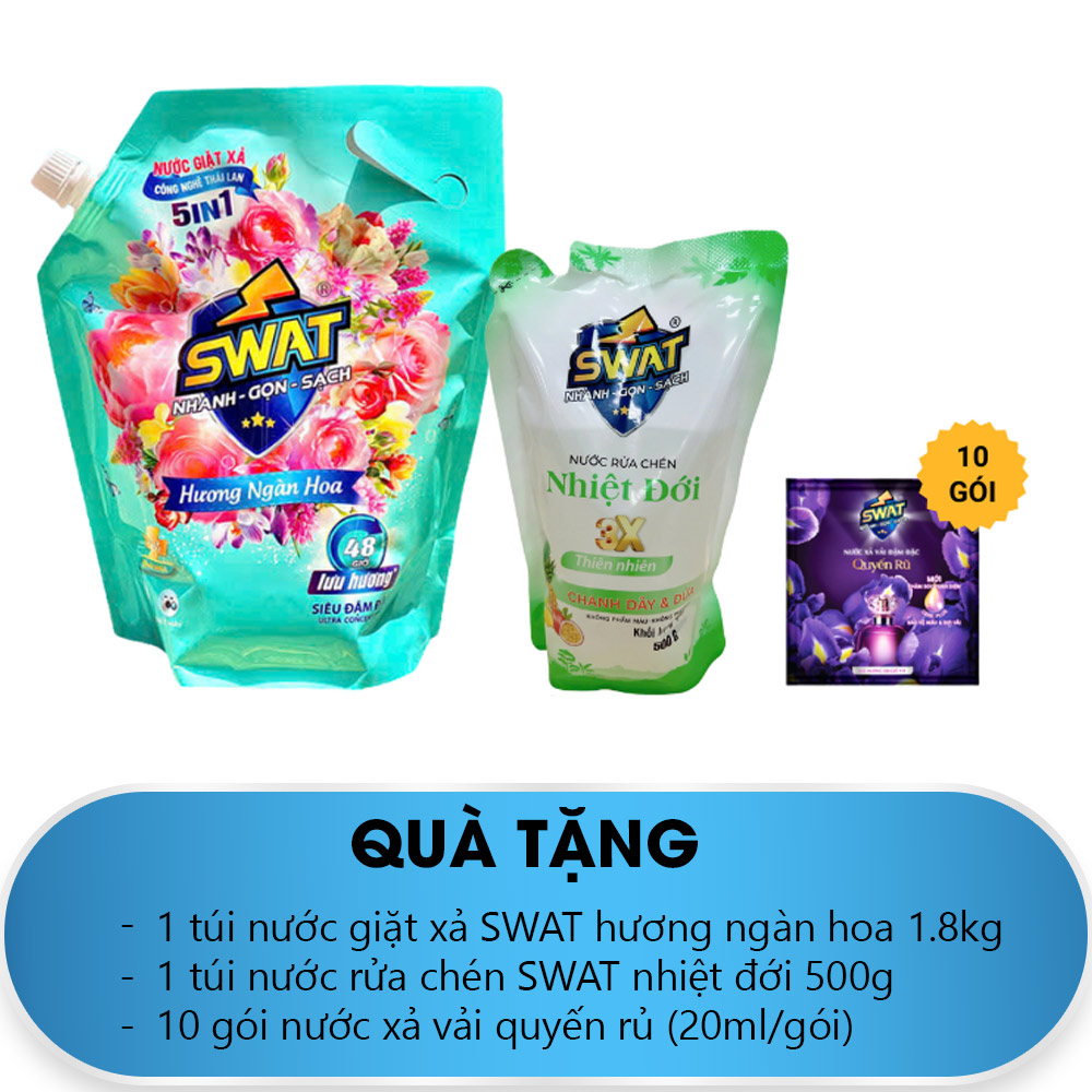 SWAT 5can giặt xả Luxury 3,8kg + 1 túi Nước giặt xả SWAT hương ngàn hoa 1.8kg + 1 túi Nước Rửa chén SWAT nhiệt đới 500g + 10 gói Nước xả vải quyến rũ 20ml