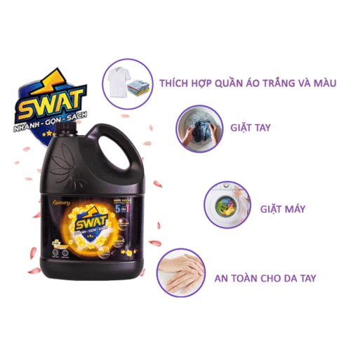 Nước giặt xả Swat Luxury với công thức siêu đậm đặc 5 trong 1 giúp đánh bật các vết bẩn cứng đầu, mang lại hiệu quả giặt sạch gấp 5 lần so với nhiều loại nước giặt thông thường khác