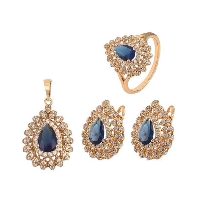Bộ Trang Sức ngoc trai Nước Ngọt và Hình Thoi Đính Đá Xanh Dương 7-8 li – Vòng Cổ, Bông Tai và Nhẫn