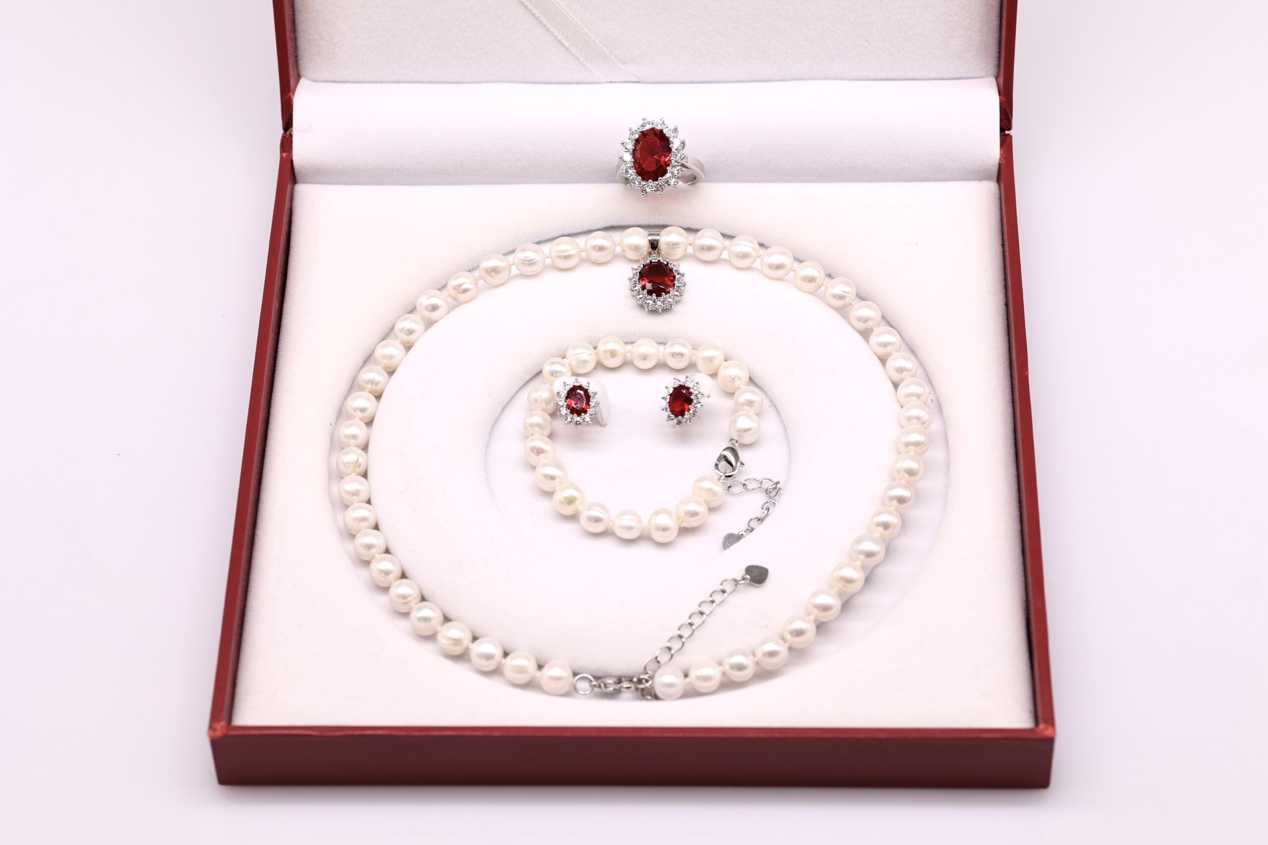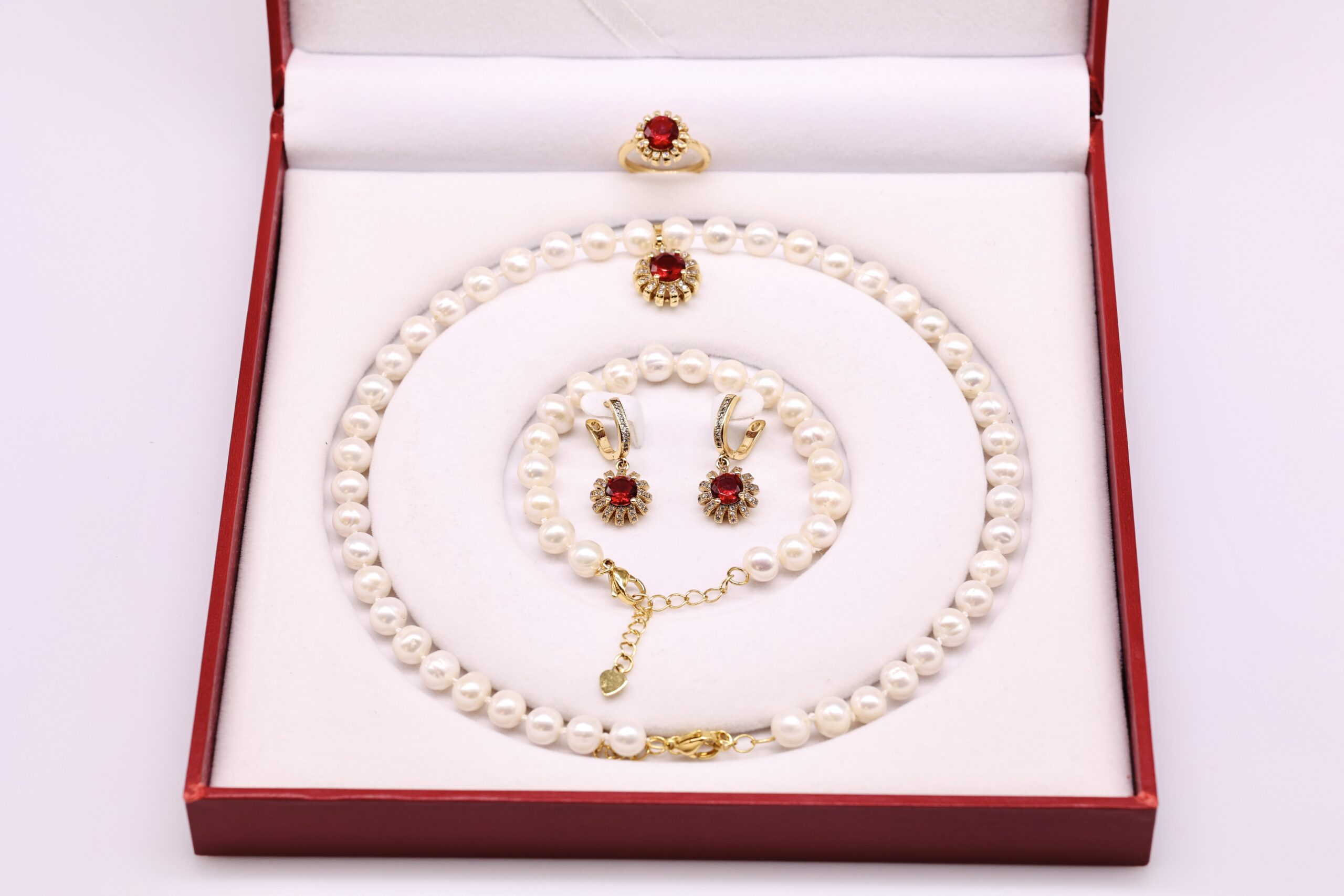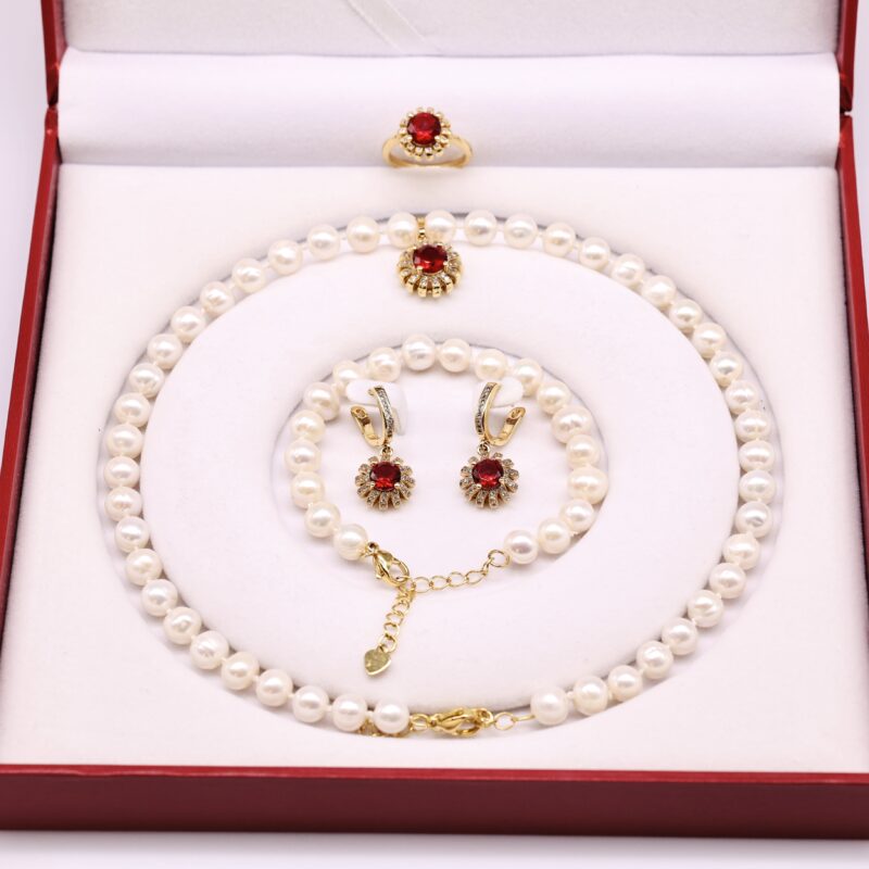 Bộ Trang Sức ngọc trai Nước Ngọt và Hoa Nhụy Hồng Ngọc Cánh Lấp Lánh 7-8 li – Vòng Cổ, Vòng Tay, Bông Tai và Nhẫn
