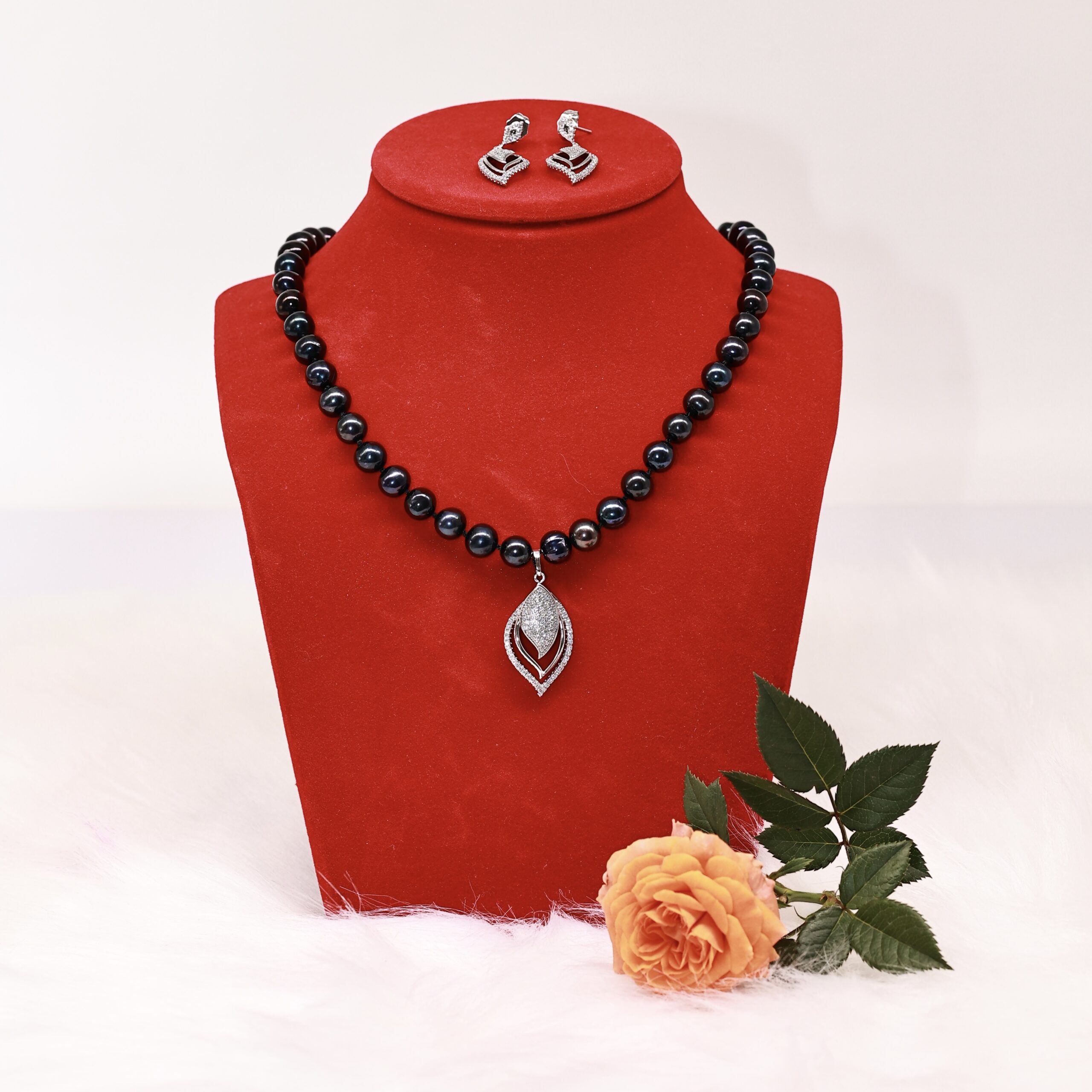 Bộ Trang Sức ngoc trai Nước Ngọt Xanh tím 7-8 li và Bông Tai 2 Lớp Viền Lá