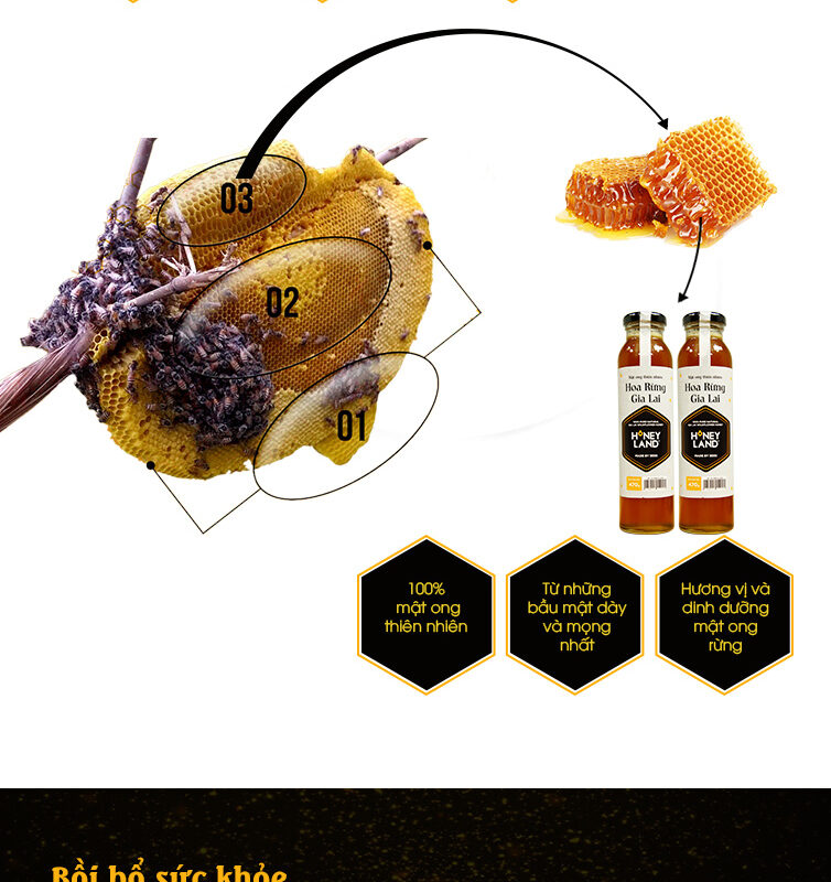 Mật ong hoa rừng Gia Lai HoneyLand nguyên chất 100% được nuôi và khai thác tại Gia Lai. Mật ong có màu hổ phách, vị ngọt thanh, mùi hương đặc trưng của các loài hoa rừng tự nhiên.